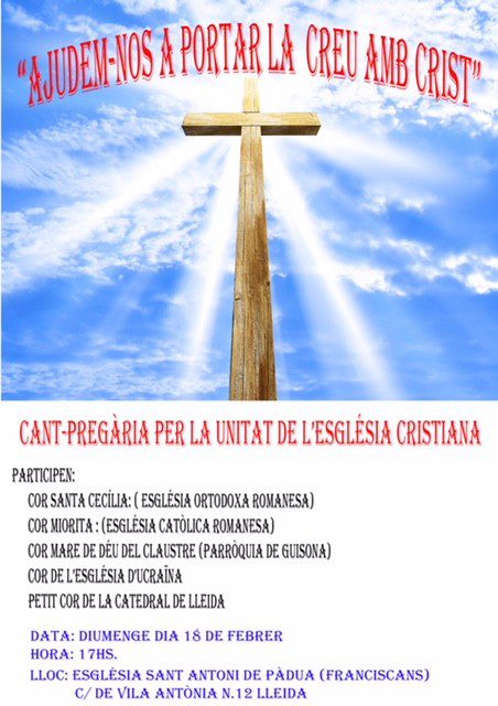 Sis corals vinculades a confessions cristianes amb presència al nostre bisbat, oferiran aquest diumenge dia 18 de febrer al Santuari de Sant Antoni de Pàdua (Franciscans) un concert de cants litúrgics per la unitat dels cristians amb el títol “Ajudem-nos a portar la Creu amb Crist”: