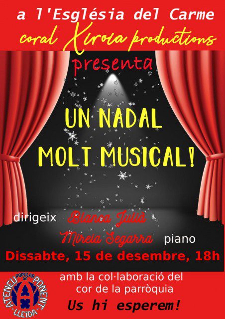 Concer de la Coral Xiroia de l’Ateneu Popular de Ponent, dirigida per Blanca Julià. Se celebraran els 20 anys de la primera actuació de la Coral del Carme, la Nit de Nadal de 1998, dirigida per Blanca Julià Traveria.