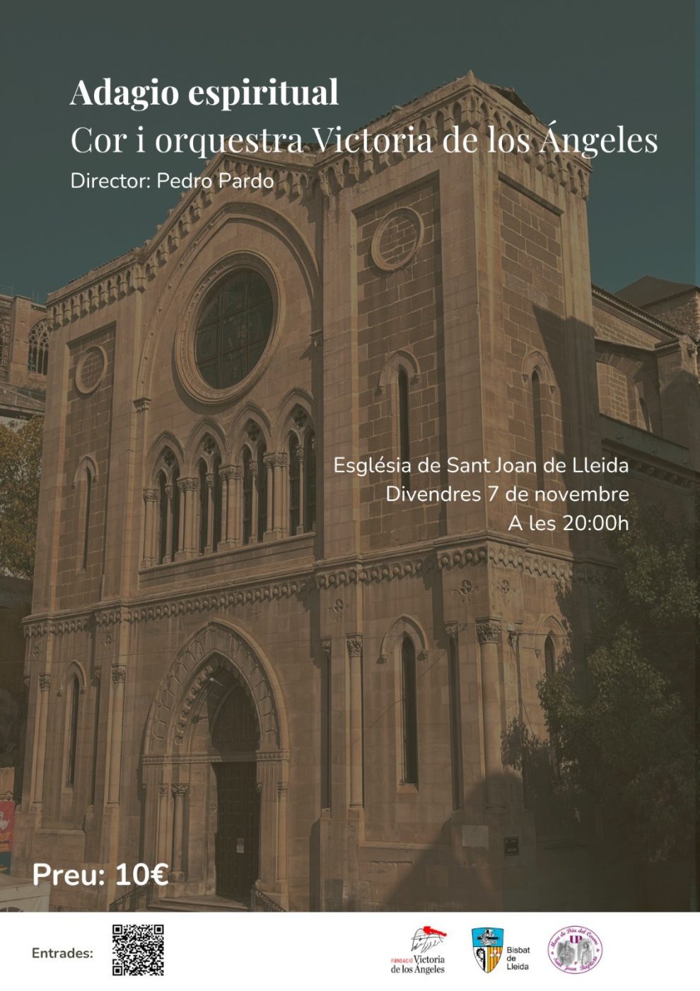 El concert “Adagio Espiritual” és una nova proposta artística de la Fundació Victoria de los Ángeles a càrrec del Cor i l’Orquestra Victoria de los Ángeles (OSVA) sota la direcció del lleidatà Pedro Pardo. A més de ser una vetllada musical excepcional, aquest concert forma part de la celebració dels 130 anys de la consagració de la parròquia de Sant Joan, i vol combinar música, història i espiritualitat en un espai emblemàtic de Lleida, amb ocasió del 130è aniversari de la consagració de l’església actual.