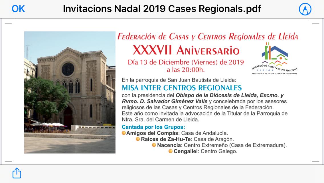 Presidida pel Bisbe Salvagor Giménez Valls i concelebrada pels assessors religiosos dels Centres i Cases Regionals de la Federació i cantada pels grups Romero y Jara, Za-Hu-Te, Nacencia i Cengallei.