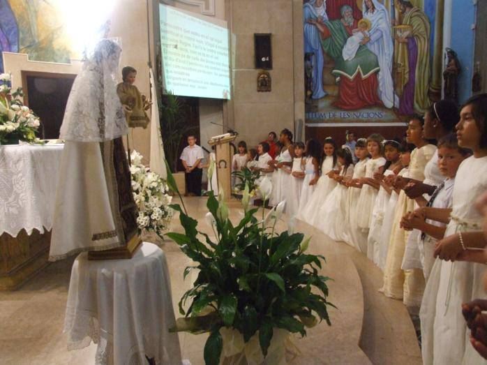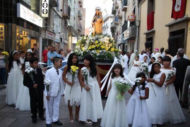 Participació dels diferents grups religiosos de la parròquia del Carme, entitats cíviques i infants en l’ofrena floral i cants a la Mare de Déu..