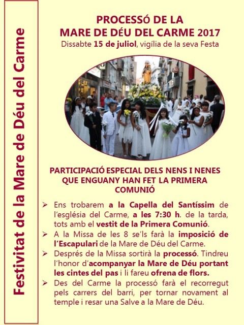 A la PROCESSÓ hi són convidats molt especialment els nens i nenes que han fet la PRIMERA COMUNIÓ aquest any i tots els altres nens que hi vulguin participar.