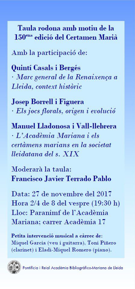 Taula rodona per commemorar les 150 edicions del Certamen Marià, ‘Els Jocs Florals de Maria’, amb la intervenció de: