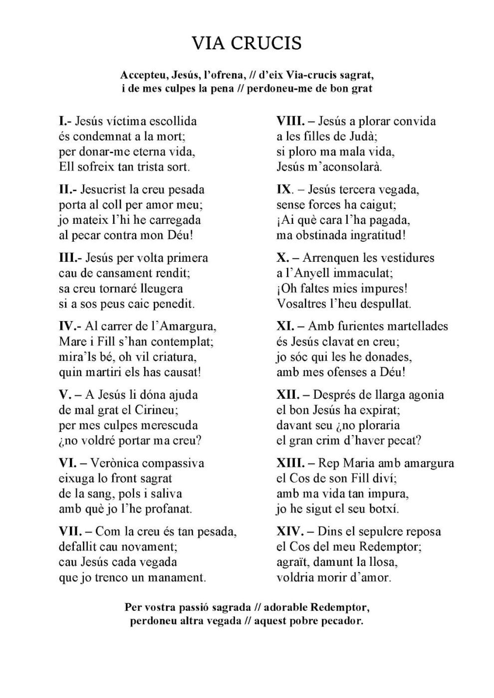 Per als que no pugueu assistir al viacrucis, us convidem a fer-lo a casa de manera senzilla seguint les estrofes del cant clàssic català del viacrucis que adjuntem.