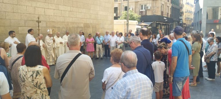 Unes cinquanta persones han participat aquest migdia en una pregària per la pau que, encapçalada pel bisbe Daniel, s’ha celebrat al davant de la catedral de Lleida un cop finalitzada l’eucaristia amb motiu de la Mare de Déu d’Agost, patrona