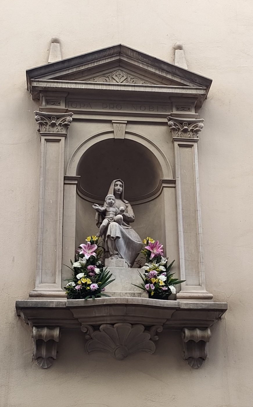 Finalitzada la celebració tots els assistents, van traslladar-se fins la capelleta de la façana lateral de l’església de Sant Pere al carrer Major, on hi ha l’escultura de la Mare de Déu de l’Arcada de l’escultor tortosí Innocenci Soriano Montagut, inaugurada l’any 1961. Allí es feu la ja tradicional ofrena de flors i la Coral del Carme va cantar els seus goigs en honor de la Patrona. També es va fer una pregària per la salut de Miquel Angel Soriano, fill de l’autor d’aquesta imatge.