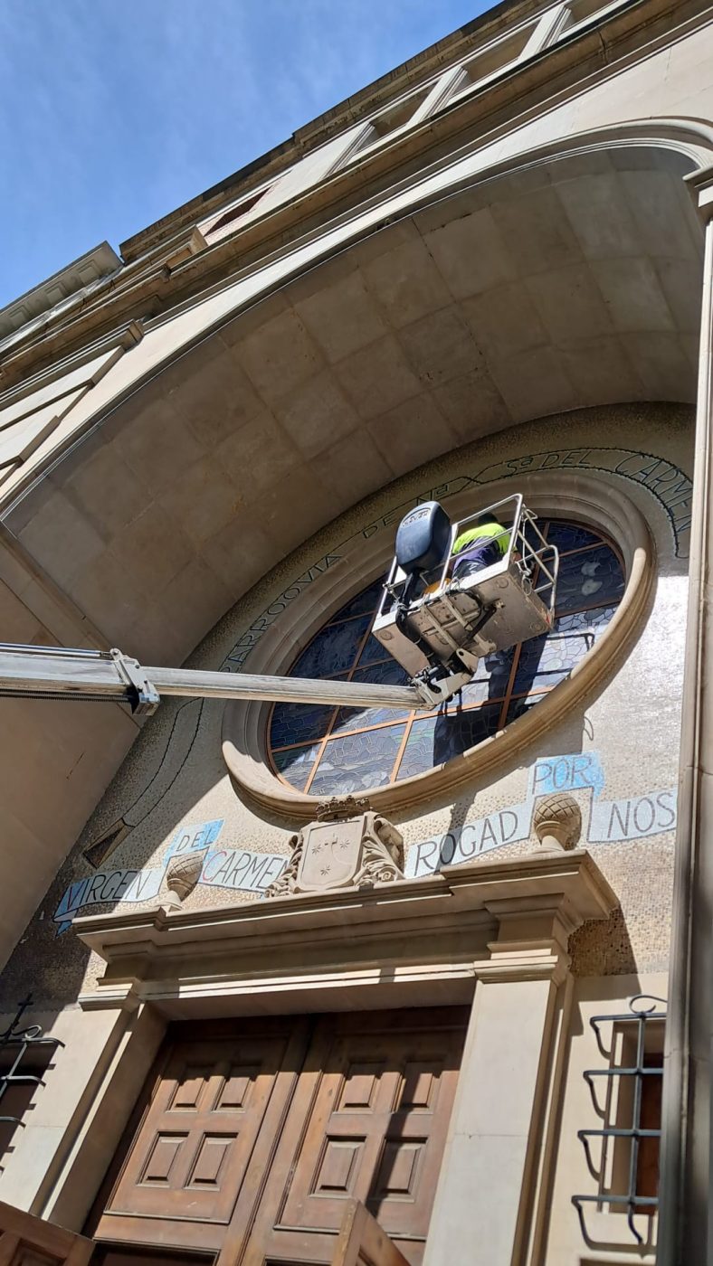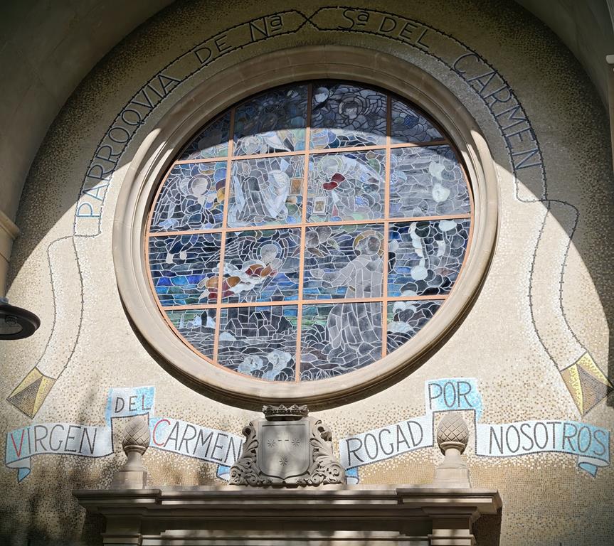 Aprofitant aquesta intervenció, s’ha netejat el gran i majestuós vitrall que decora la gran rosassa que presideix el pòrtic a manera d’arc de triomf que presideix l’entrada principal del temple. L’escena, visible des de l’interior, recrea l’escena de Sant Simó Stock rebent l’Escapulari de mans de la Mare de Déu del Carme al convent carmelità d’Aylesford Kent (Anglaterra), l’any 1251. Obra del taller de Josep Maria Bonet, de Barcelona, l’any 1960, el vitrall va ser sufragat per la parròquia a base de donatius de feligresos. Té un gran valor artístic i espiritual.